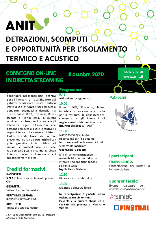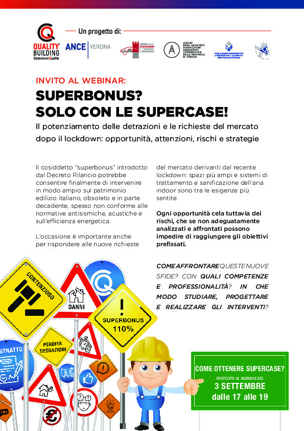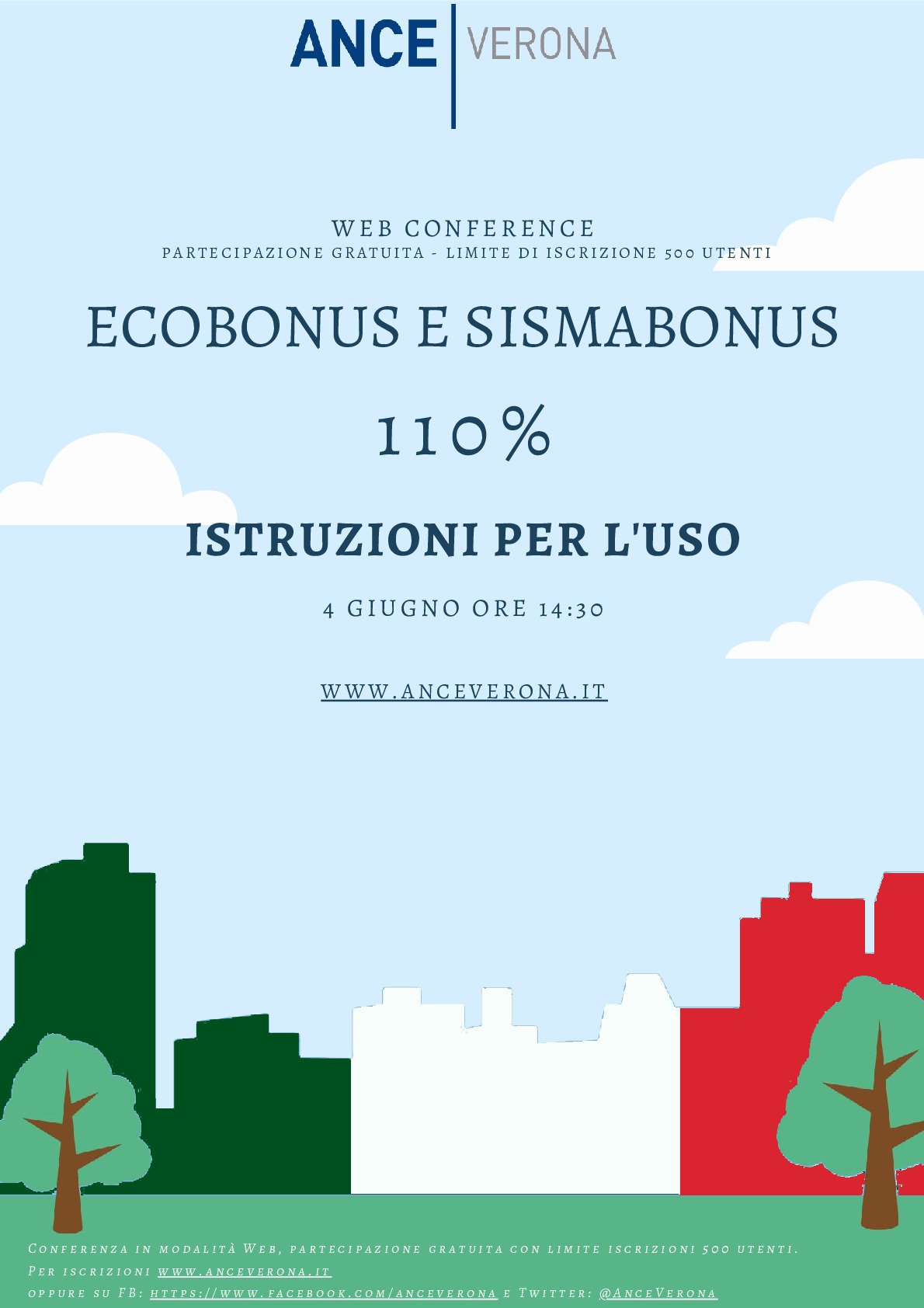 Locandina 110 - 4 giugno 2020Ance Verona è lieta di invitarvi alla web conference “110% Ecobonus e Sismabonus – Istruzioni per l’uso” del 4 giugno p.v. ore 14.30 su piattaforma gotomeeting. Al seminario sono stati concessi 04 CFP. Per iscriversi … Continua a leggere