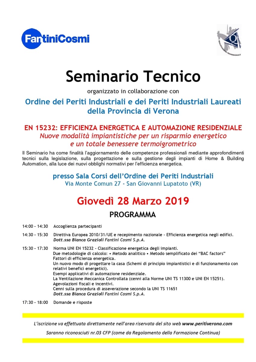 Ordine dei Periti Industriali e Periti Industriali Laureati della Provincia di Verona via Monte Comun 27, San Giovanni LupatotoNuove modalità impiantistiche per un risparmio energetico e un totale benessere termoigrometrico Il Seminario ha come finalità l’aggiornamento delle competenze professionali mediante approfondimenti tecnici sulla legislazione, sulla progettazione e sulla gestione degli impianti di Home & Building Automation, alla luce … Continua a leggere