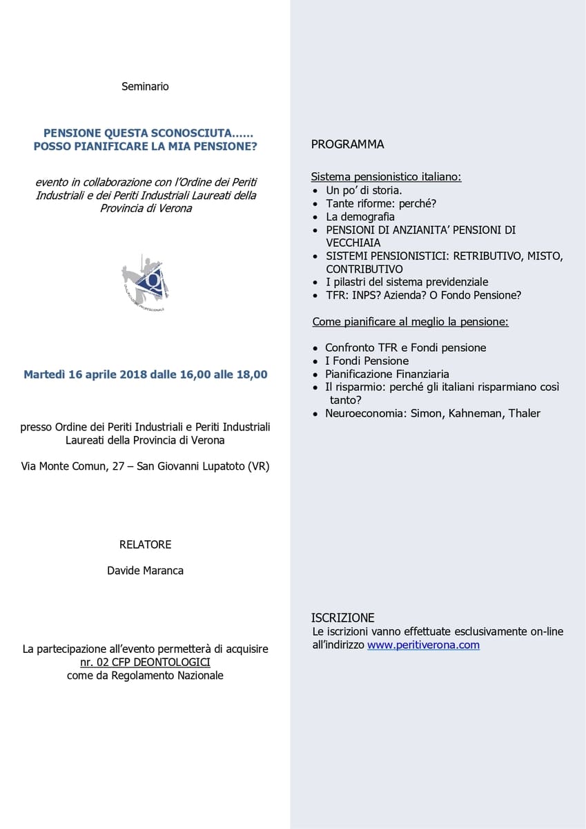 Ordine dei Periti Industriali e Periti Industriali Laureati della Provincia di Verona via Monte Comun 27, San Giovanni LupatotoSeminario PENSIONE QUESTA SCONOSCIUTA......POSSO PIANIFICARE LA MIA PENSIONE? evento in collaborazione con l’Ordinedei Periti Industriali e dei Periti Industriali Laureati della Provincia di Verona locandina_pensioni_16_04_2019