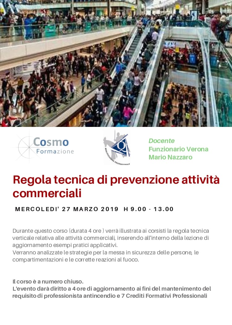 Ordine dei Periti Industriali e Periti Industriali Laureati della Provincia di Verona via Monte Comun 27, San Giovanni LupatotoDurante questo corso verrà illustrata ai corsisti la regola tecnica verticale relativa alle attività commerciali, inserendo all'interno della lezione di aggiornamento esempi pratici applicativi. Verranno analizzate le strategie per la messa in sicurezza delle persone, le compartimentazioni e le corrette … Continua a leggere