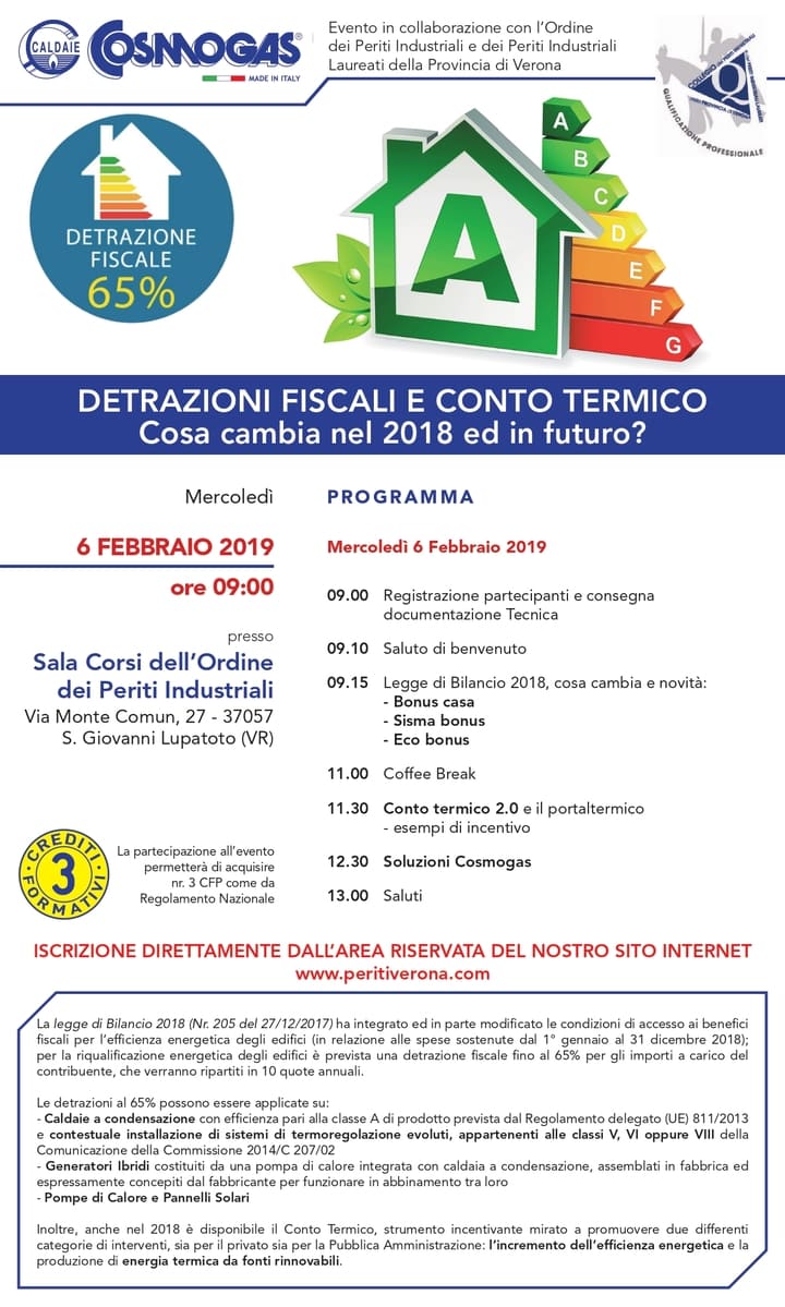 Ordine dei Periti Industriali e Periti Industriali Laureati della Provincia di Verona via Monte Comun 27, San Giovanni LupatotoLa legge di Bilancio 2018 (Nr. 205 del 27/12/2017) ha integrato ed in parte modificato le condizioni di accesso ai benefici fiscali per l’efficienza energetica degli edifici (in relazione alle spese sostenute dal 1° gennaio al 31 dicembre 2018); per … Continua a leggere